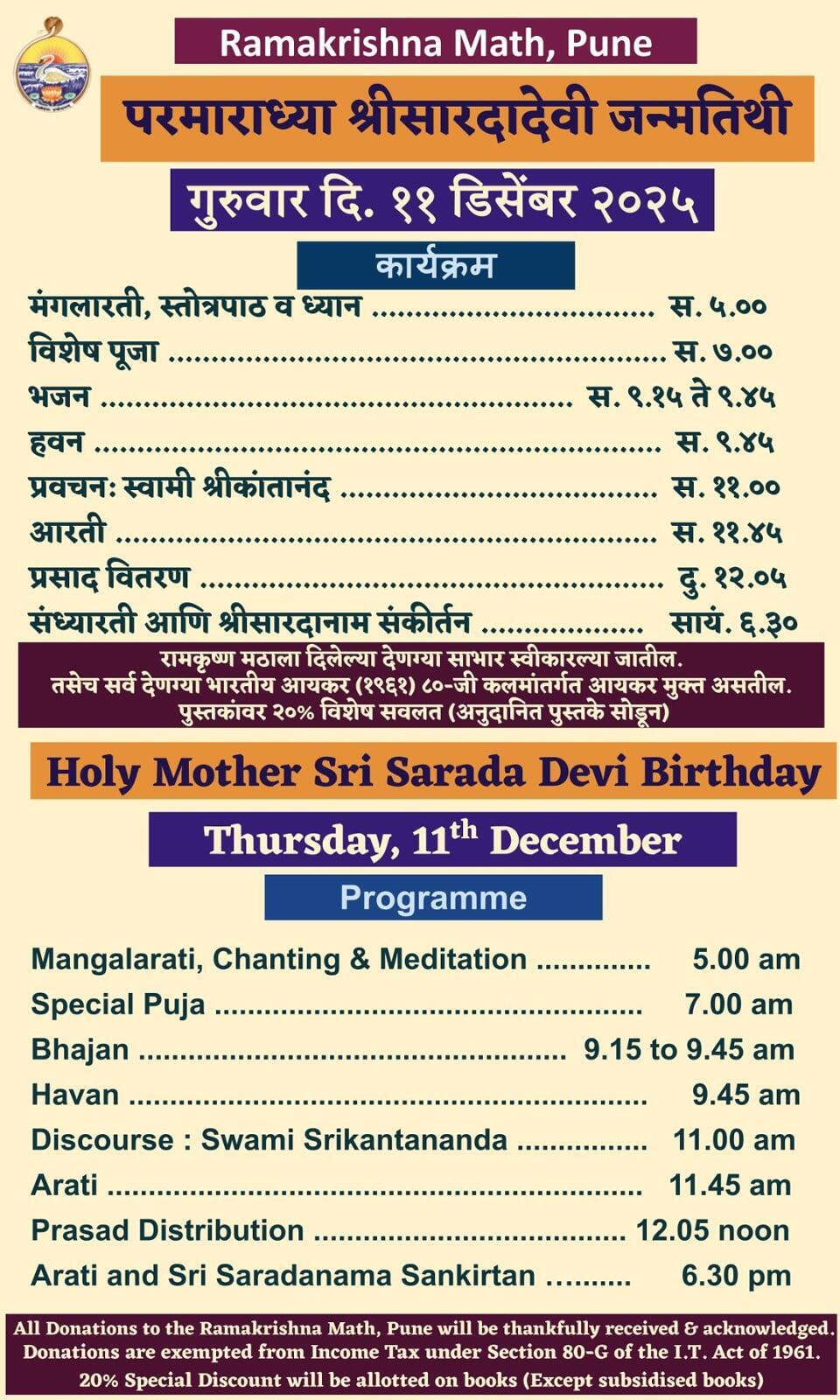 Holy Mother Sri Sarada Devi Birthday Thursday 11th December 2025